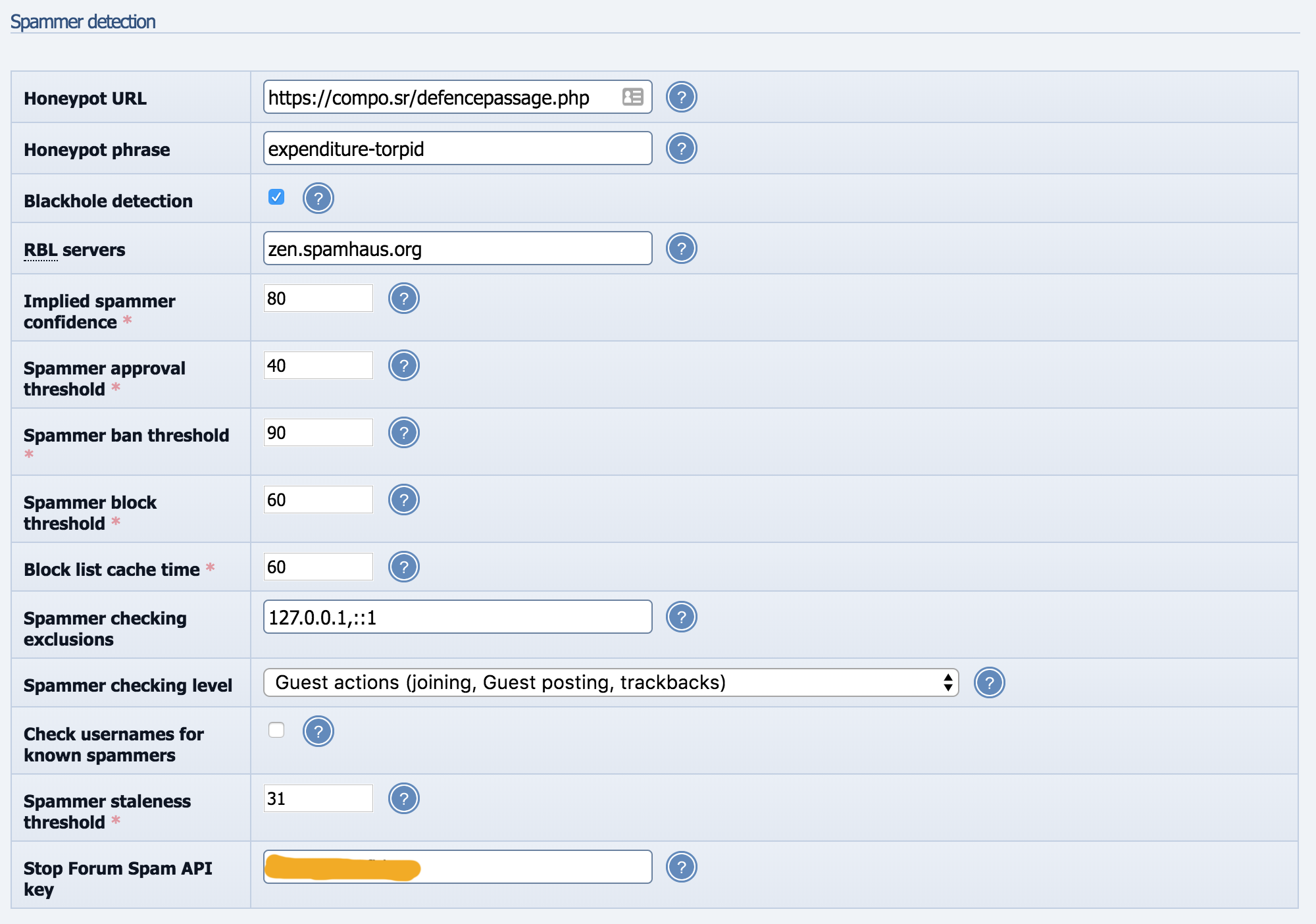 Don't copy my Project HoneyPot settings directly, you'll need to set it up yourself, uploading a script file, and configuring against it. You also need to create a StopForumSpam API key. You can, however, use the RBL Servers option directly.