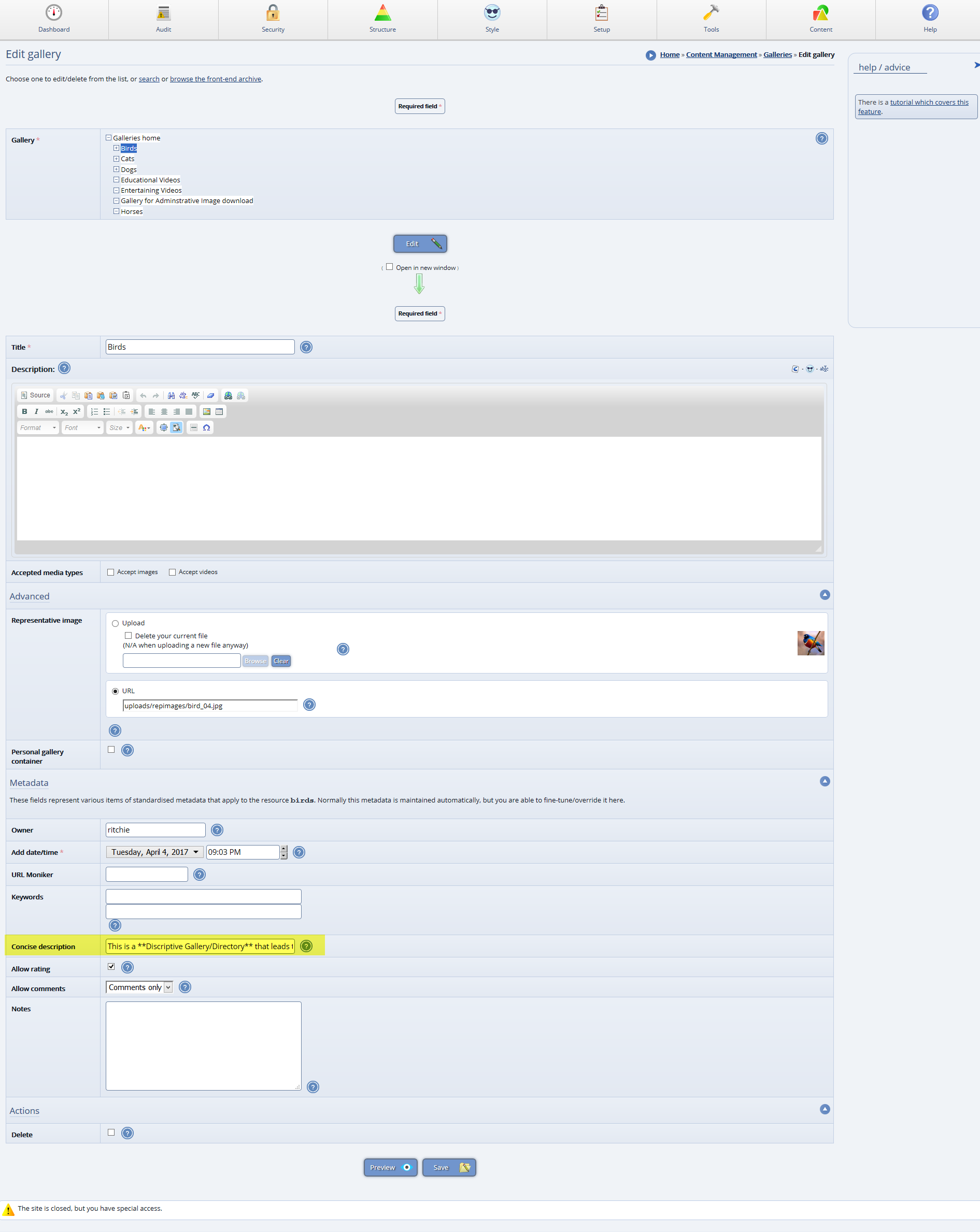 Going through my *parented directories, I wanted to make sure that "Allow Comments" was not ticked. Only one directory had the "concise Description" auto filled with a statement that I did not place there. The statement reads as follows:This is a **Discriptive Gallery/Directory** that leads to a **sub-directory** of either *(Videos)* or *(Pictures).* ==========================================…