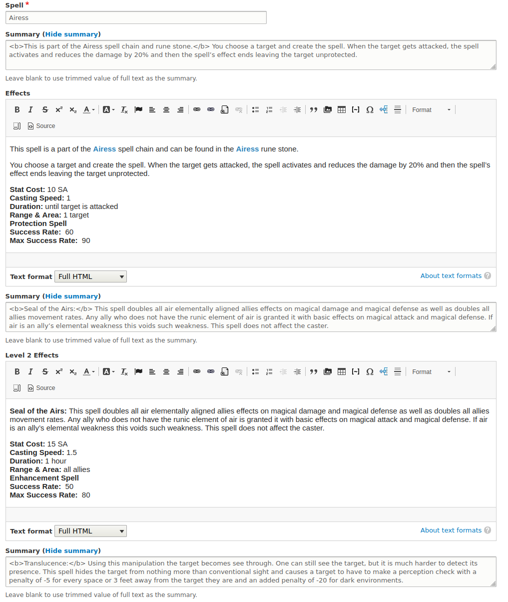 For summaries, you can't exactly add a summary to a paragraph field. What I would recommend is add a summary field first, visible on catalogue category screens etc. Then add the paragraph field immediately under it, not visible on the search / category screens. While both fields will be visible when viewing the individual spell, only the summary should show on the table.
