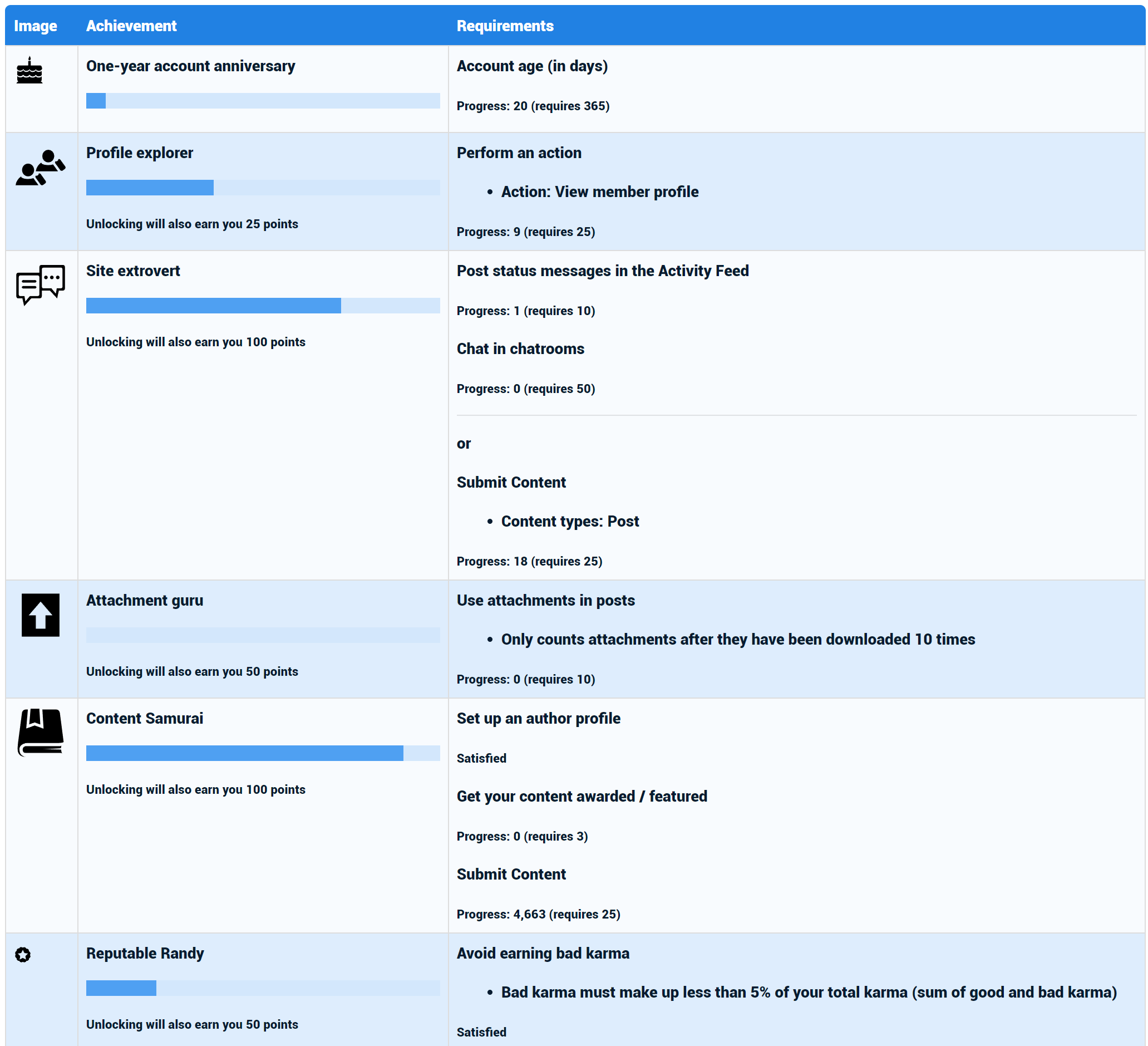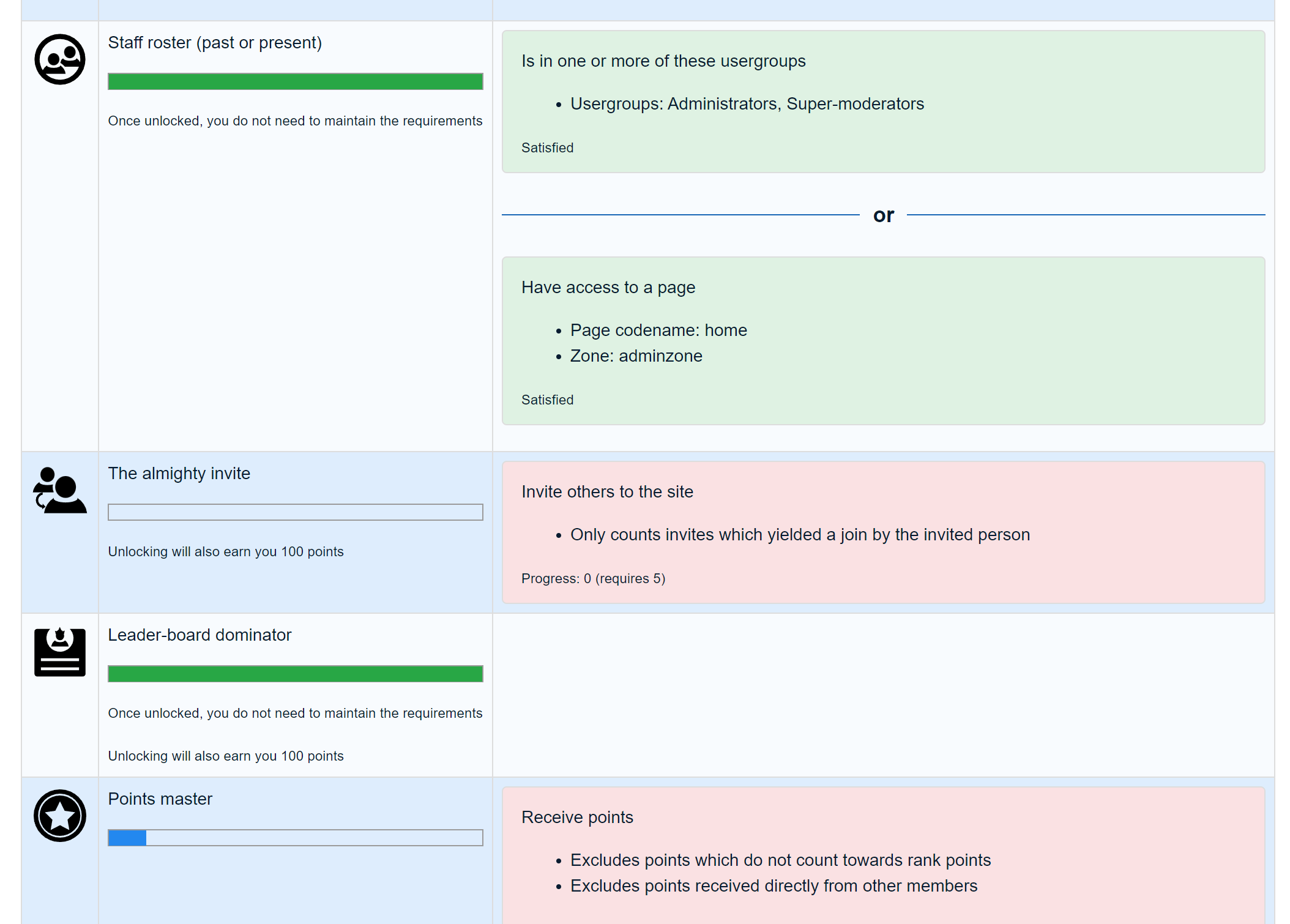 The idea of achievements actually originated from Chris Graham: 0000871: Admin achievements system (gamification) - Composr CMS feature tracker . The original premise was to encourage webmasters to explore the full range of Composr features; they would earn achievements for setting up certain content / pages and doing different things. I plan to implement these as well, but they will be "hidden" achievements since particularly only staff would get those. Most would be easy to implement because most log an action in the actionlog when completed. And there is a qualifications hook for counting the number of a specific action in the actionlog done by a member.