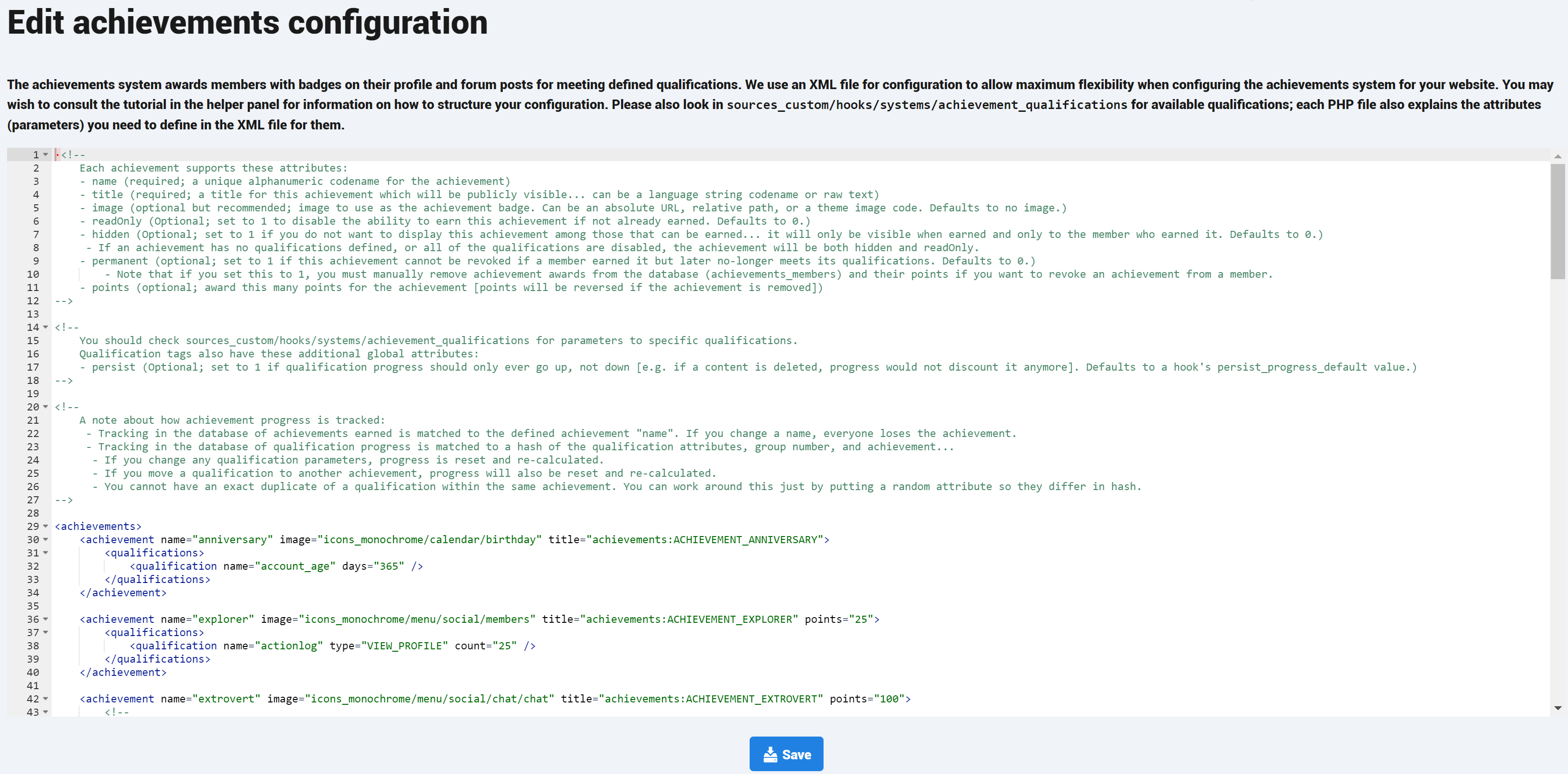 The entire configuration of the achievements system is defined as an XML file. A default set of achievements will be included for you when installing the addon to help you get started.