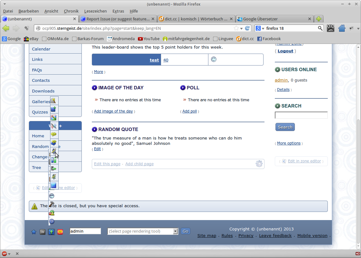 | Description | Sorry, me again. Seems that the footer Admin menu doesn't work correctly. With my Firefox 18.0.1 on Xubuntu it looks kinda weird (see attached image). And the links doesn't work for me. Furthermore it would be helpful, if you could add some textual explanations, because some symbols exist several times. A full pull-down (or pull-up?) menu would be nice :) Best regards Falko | ||||