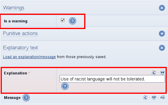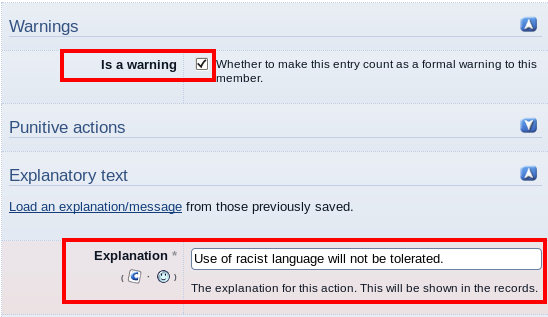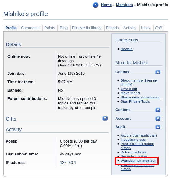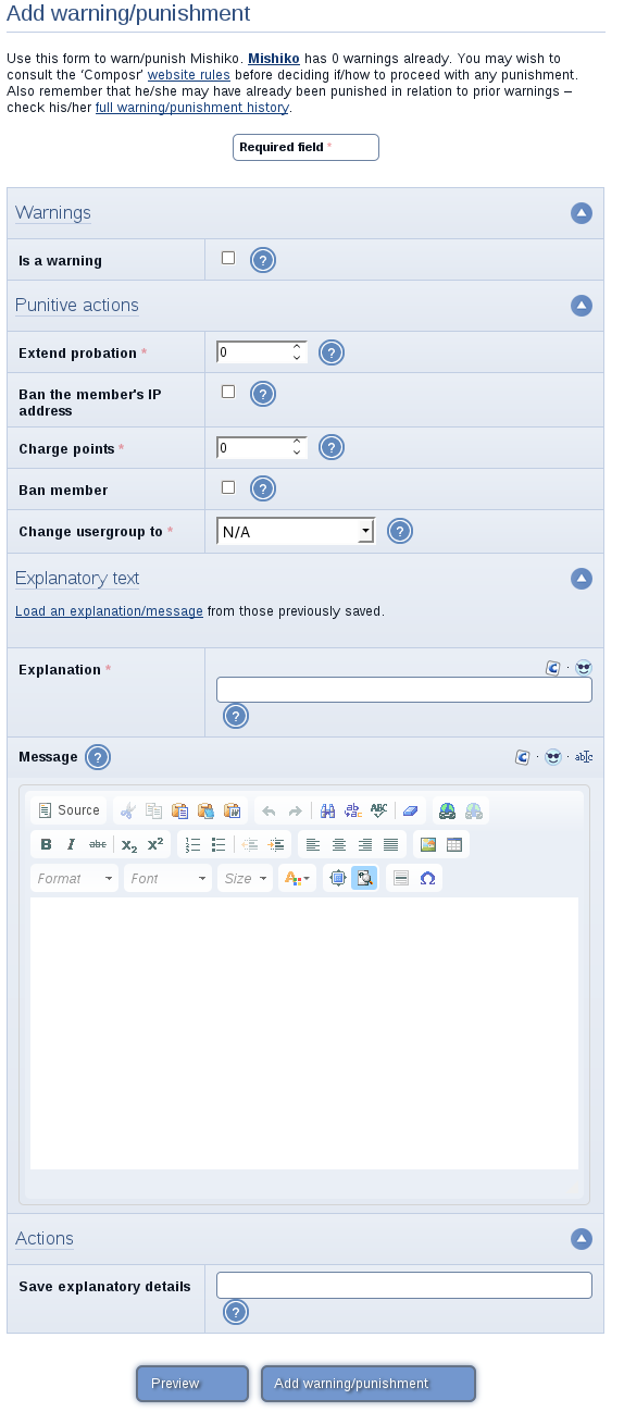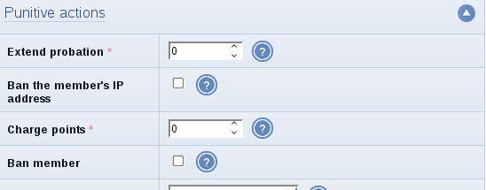 Dealing with nuisance members Composr provides a number of ways to deal with the annoying users or the users who do not adhere to the site policies. Currently the following actions can be taken against nuisance members, 1) Charging their points. 2) Ban them, or their user-name, or their IP address, or their ability to make submissions 3) Probation or Moving them to a restricted usergroup ( i.e putting them into a usergroup that requires validation of all forum posts). 4) Giving them a formal warning/verbal warning. All the various punishment tools mentioned above are made available on one form named 'Add warning/punishment' form and that form can be accessed from the members' profile through "Warn/punish member" link in “Audit” (image_001.png). The 'Add warning/punishment' form contains the options for all the above mentioned actions against a nuisance member.(image_002.png) 1) Charging points – Points can be charged as a punishment by charging them for abuse, you can go to the points screen by visiting the member-profile and clicking the “Points” section tab, there you can see the area for charging them points and also state a reason about why they were charged.(image_003.png) 2) Ban them – Members can be banned from the site permanently for their actions, this can be done by using the 'Add warning/punishment' form through 'Audit >> Warn/Punish member' in the member-profile page.(image_004.png) 3) Putting the member in probation – You can put the member manually into the Probation usergroup which will restrict their privileges to a good extent, this can be done by setting the 'Change usergroup to' field with 'Probation' in the 'Add warning/punishment member' form. And as a punishment you can also extend this probation period by setting the 'Set Probation' field in the form. It's a common practice to make *all* members with less than a certain number of points require validation of all forum posts (via permissions on usergroups in coordinate with the usergroup-based rank system). 4) Formal warning – You can provide a formal warning or a verbal warning to the user instead of banning them permanently, this will appear in the member's screen as an alert when he/she logs in next.(image_005.png) |