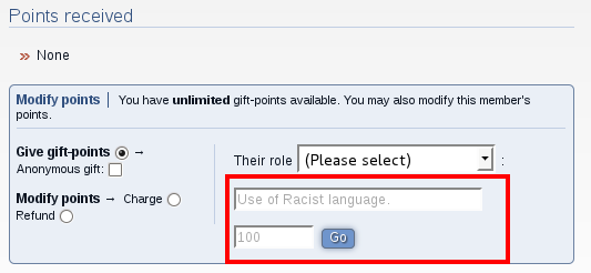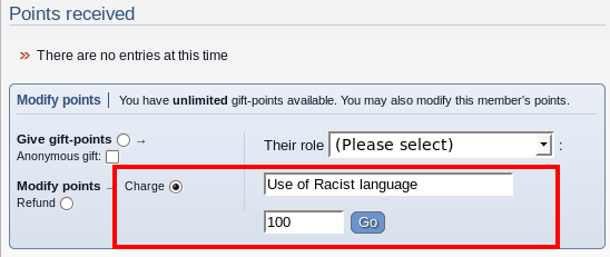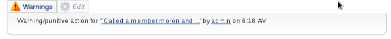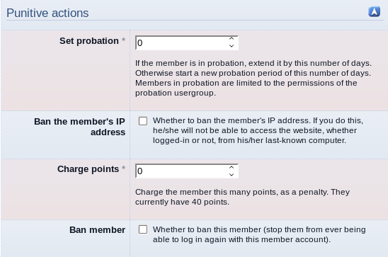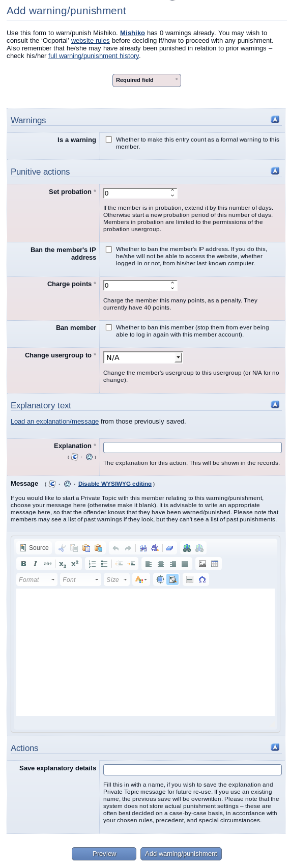 | Description | Punish feature - Ban them - Ban IP addresses - Giving them warnings - Probation, putting them into a usergroup that requires validation of all forum posts If it's a common occurrence, make *all* members with less than a certain number of points require validation of all forum posts (via permissions on usergroups in coordinate with the usergroup-based rank system). | ||||