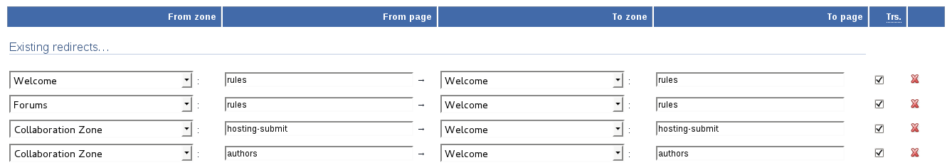 Transparent Redirects ---------------------------------- What are Transparent Redirects ? Transparent Redirects are a way of redirecting the URL or say a module from its current zone to a different zone and this redirection would be 'transparent' such that the user doesn't know a redirection is in place, and thus sees the page as if it was in the zone they accessed it from. Where and how to Write Transparent Redirects? You can access the Redirects page by logging in to the Adminzone, and select 'Structure' , in the drop down you should see the link 'Redirects' which will take you to the Redirects page(as seen in the image) image: redirect1.png Here you should see a tabular structure with the following sections(as seen in above image), From Zone : From Page -> To Zone : To Page and a Trs. Column(checkbox) which stands for Transparent, if Trs is checked the redirect would be a Transparent one. A normal redirect can be written as follows, say you want to redirect website visitors straight to the “Forums” zone, you could add a redirect on the “Welcome” zone start page, to the “Forums” zone forumview page, you can try this new redirect by scrolling towards the bottom of the page and you should find the “New Redirect” section, this is where we define our new Redirects, lets create our new redirect as "Welcome : start -> Forums : forumview".(refer image) image:redirect2.png After entering the details hit “save”. Now let's test if our new redirect works, go back to your Home page or the Front page and see the results, if you entered all the details correctly as above you should now see that you are directly redirected to “Forums” page instead of “Home” page. Look closely at the URL of your current home page i.e Forums after redirection, you should see this line in the URL “page=forumview” , this tells you which page was called instead of your home page in this case it was Forum zone's forumview page, this a normal redirect and hence the details are visible as is, the user can look at the URL and tell he was redirected to this particular page. Now let's try the same for a Transparent redirect and see the results. To make a redirect transparent we need to check the Trs field which indicates that the redirection should be transparent and the user should not know that a redirection has happened in the background,let's go back to our “Redirects” page and check the Trs field to make our redirect Transparent(refer image). Image:redirect3.png Once checked, hit “save” again and lets go back to home page to see the results. When you visit the home page you are redirected to the Forums page just like earlier with the normal redirect, but take a look at the URL now, it doesn't reveal which page was called you won't find the “page” attribute in the URL like in a normal redirect, that's where transparent redirect comes in, the user has no way of knowing that he or she was redirected to this page. Now that we know how a Transparent redirect works and also how to write one, lets look at some more advanced examples, Transparent redirects to put a module in multiple zones You might often want to reference your in built modules or custom modules on your home page or any other page, but in general that could be tedious you will have to make a lot of changes in the module code itself so as to make it display it on the page you desire, however, there's a simple and better way, use a Transparent Redirect. It ties in with the breadcrumbs tutorial in that you may want particular categories to link back to the zone page, rather than the root of the content type. For example, if you have a download category called 'Staff files' with ID#5, and want this in your staff zone, you'd set up the following transparent redirect, staff:downloads -> site:downloads And then you'd edit the breadcrumbs XML file through "Adminzone >> Structure >> Breadcrumb Overrides" so that site:downloads:browse:5 maps straight back to the staff zone front page... <substitution match_key="site:downloads:browse:5"> <link label="Staff">staff:</link> </substitution> |