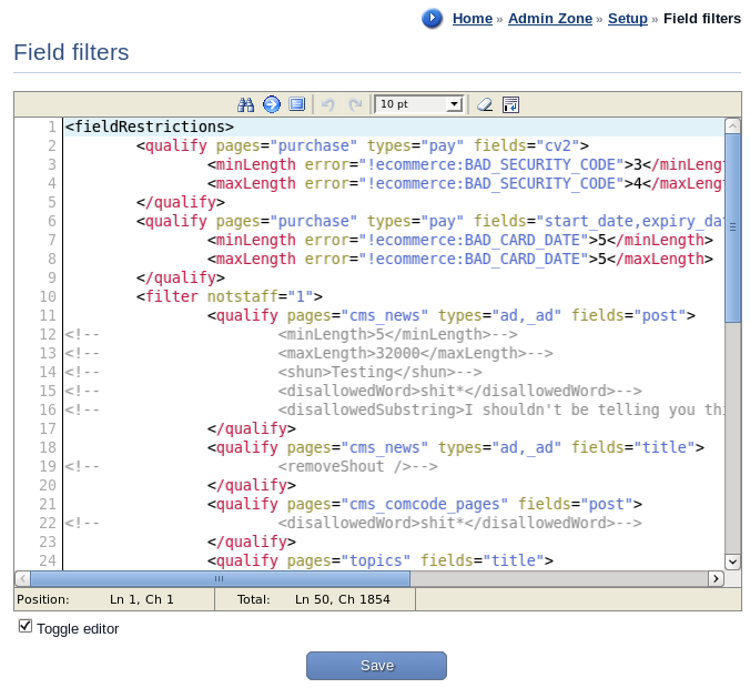 | Description | Example: Using fields.xml to remove shouting from any submitted news. There's an inbuilt editor for changing this file. | ||||
