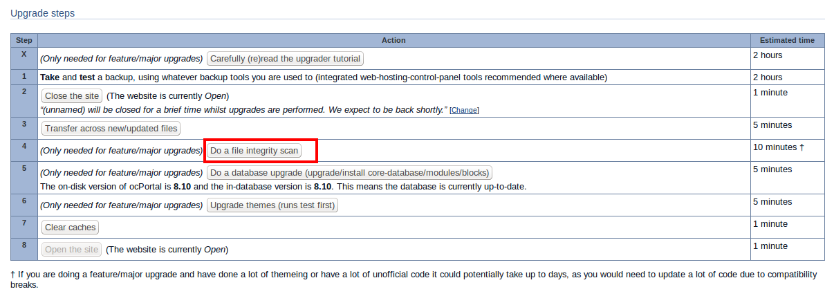 Composr comes with a built-in “integrity checker” which can be used to repair a corrupted copy of Composr. Integrity checker is a part of the upgrader tool (upgrader.php). Integrity checker can be used to find out-dated and corrupt files in the Composr system. You can use this tool at any point, regardless of whether you have recently upgraded or not. You can access the upgrader tool via upgrader.php file. For example: <yourdomain>/upgrader.php (image_001.png) You must provide the Master password to access the Composr upgrade tool. (image_002.png) The integrity checker is placed in the “Step 4” of the table under the “Upgrade steps” section in upgrader tools page. (image_003.png) Integrity checker will display a list of files which might be missing and need uploading, new or modified, alien files (if any). Integrity checker is capable of tracking the actions like changing a bundled file, deleting a file or uploading a random PHP file to the “/sources” directory. Example: ---------------- Create a random php file named testfile.php in the “/sources” directory of Composr and run the integrity checker again. Now, it will list the new testfile.php file in the results. (image_004.png) Integrity checker has the ability to handle those files of its own. Tick the checkbox next to the file name and press the “Automatically handle those ticked (checked) – delete/move as needed” button placed below the list of files. The selected files will be deleted or moved as needed. As in this case, the new file will be removed permanently from the “/sources” directory. |