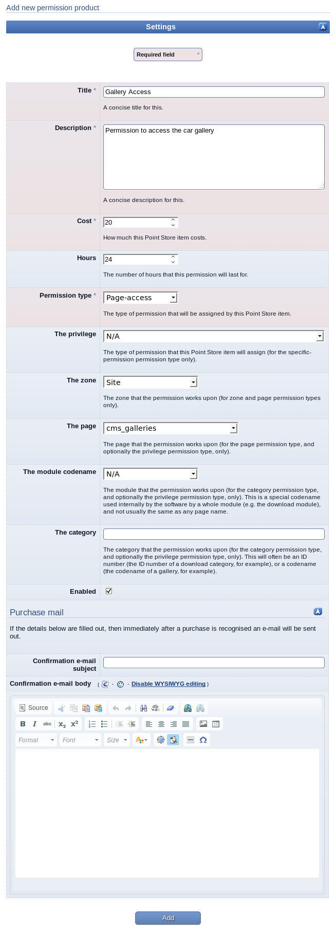 The Composr staff can set up a new permission custom item that will give certain access permission to the user. The user can gain that particular permission for a given time period by purchasing this permission item from the point store.(image_002.png)