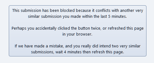 Ok on reflection, the time limit is for a technical reason. It uses the admin logs to check for duplication, but of course naturally some titles may be repeated, especially over different categories - it can't distinguish categories, so it uses time as a reasonable alternative qualifier. I think the time limit could be configurable, there could be a privilege for bypassing a forced wait, and if that privilege is there it could be a click-through screen. OR instead of a time limit/wait... We could throw out the time limit and use the CSRF tokens instead. If something with a shared title and CSRF token was already submitted, we could use that as the qualifier. (We don't delete CSRF tokens upon posting btw, as that's super annoying, so CSRF tokens don't *automatically* prevent double submissions. It annoys me in MantisBT [here], you can't use the back button properly. We do expire them though.). |