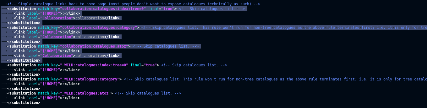 I set up a transparent redirect so catalogues could run out of the collaboration zone then added this ABOVE the default catalogue breadcrumbs.xml rules and it worked ok. <substitution match_key="collaboration:catalogues:index:tree=0" final="true"> <!-- Skip catalogues list. --> <link label="{!HOME}">:</link> <link label="Collaboration">collaboration</link> </substitution> <substitution match_key="collaboration:catalogues:category"> <!-- Skip catalogues list. This rule won't run for non-tree catalogues as the above rule terminates first; i.e. it is only for tree catalogues --> <link label="{!HOME}">:</link> <link label="Collaboration">collaboration</link> </substitution> <substitution match_key="collaboration:catalogues:atoz"> <!-- Skip catalogues list. --> <link label="{!HOME}">:</link> <link label="Collaboration">collaboration</link> </substitution> |