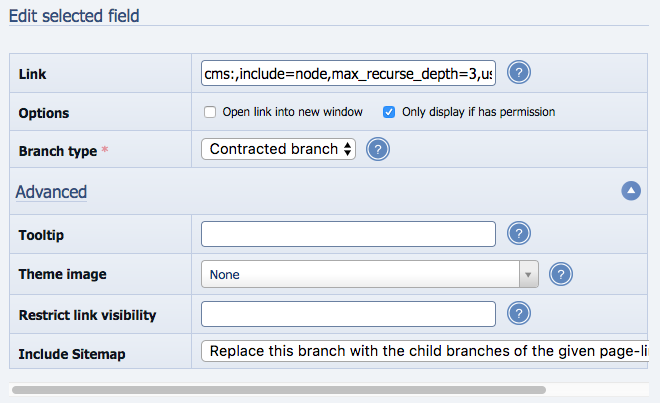 The links are obscured in the screenshot, they are: adminzone:,include=children,max_recurse_depth=4,use_page_groupings=1 and cms:,include=node,max_recurse_depth=3,use_page_groupings=1 I could have jsut used "adminzone" and "cms:', but I had to configure it to use the page grouping system for it to lay them out nicely like the Admin Zone default menuing does. |