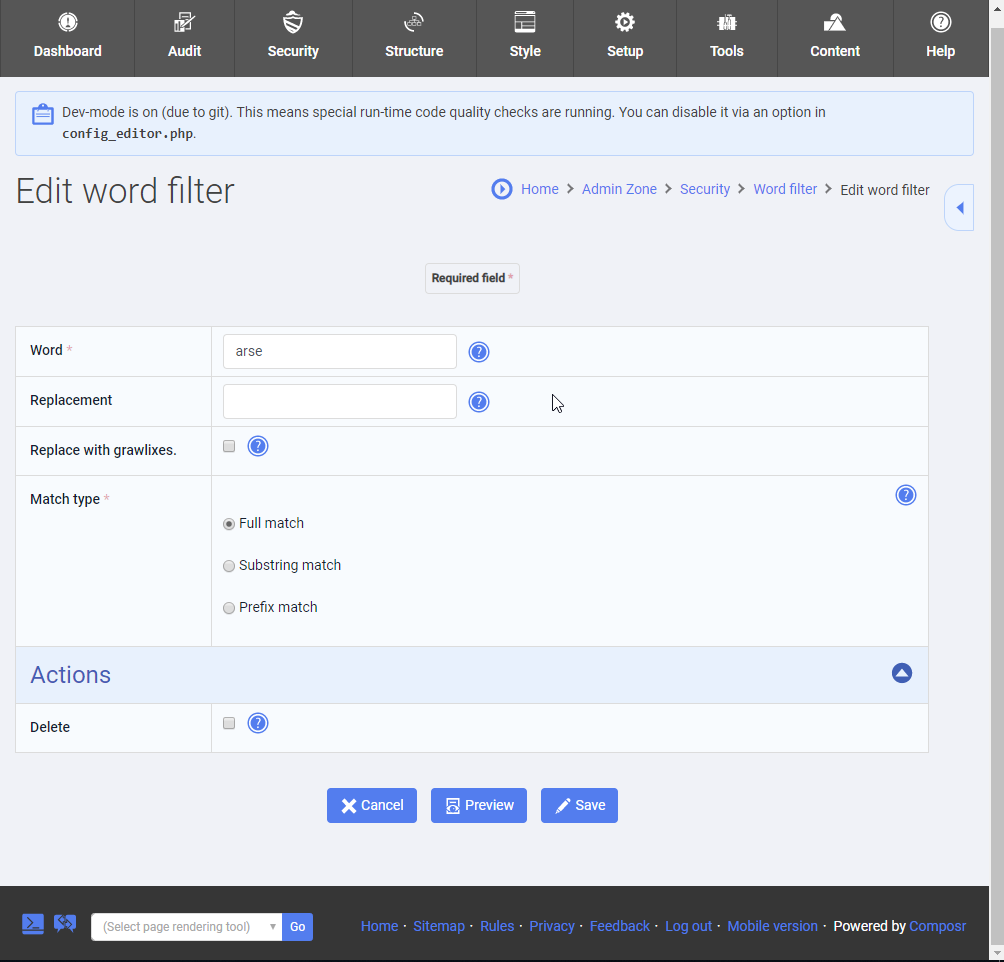 | Description | Change to a normal CRUD-module style system, so you can fully edit existing filtered words. Implement support for prefix matching. Review all the defaults, how each are matched. Make all the defaults to substitutions, rather than blocks. | ||||