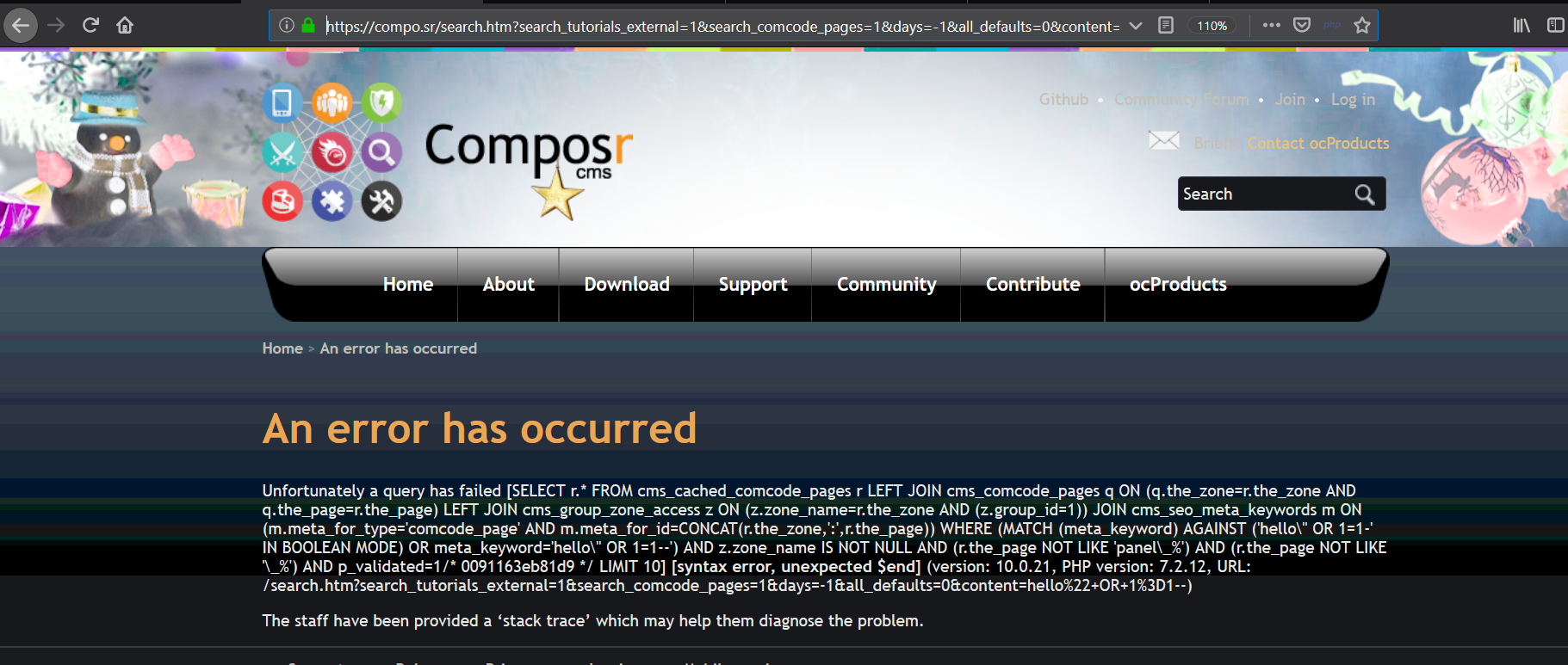 | Steps To Reproduce | Step1: Visit the url https://compo.sr/ Step2: Go to the search field and enter any sql characters like the below url https://compo.sr/search.htm?search_tutorials_external=1&search_comcode_pages=1&days=-1&all_defaults=0&content=hello%22+OR+1%3D1-- Step3: It will trigger the SQL Error as shown | ||||