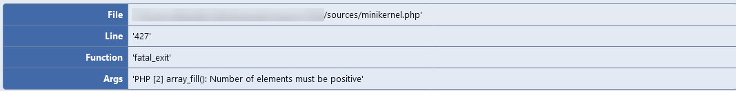 | Summary | 0004811: array_fill(): Number of elements must be positive | ||||