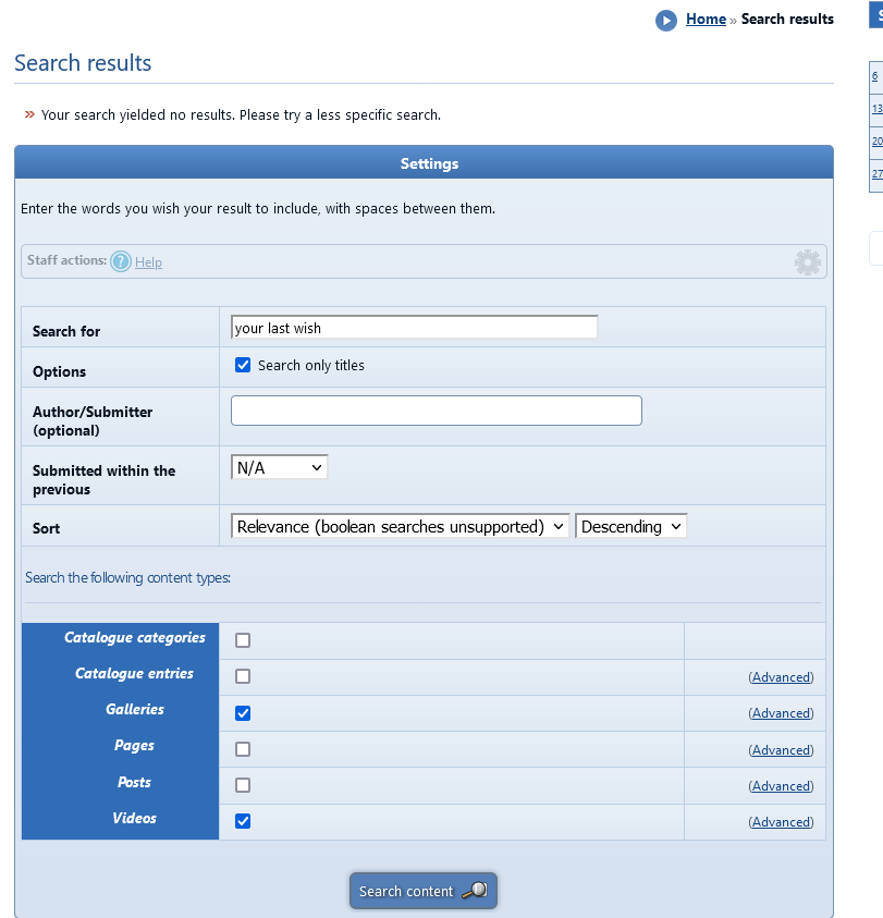 The title of the gallery category is Your Last Wish (autocompletes when searching but doesn't return anything) Meta tags on the category such as Canada, Female Fronted Metal, Melodic Death Metal return results Adding Your Last Wish as a meta tag weirdly also fails to return anything (but I'd prefer a return on the title than adding an additional tag for the band name anyway). Other category titles are returning results in search, so maybe this is stop words or something? |