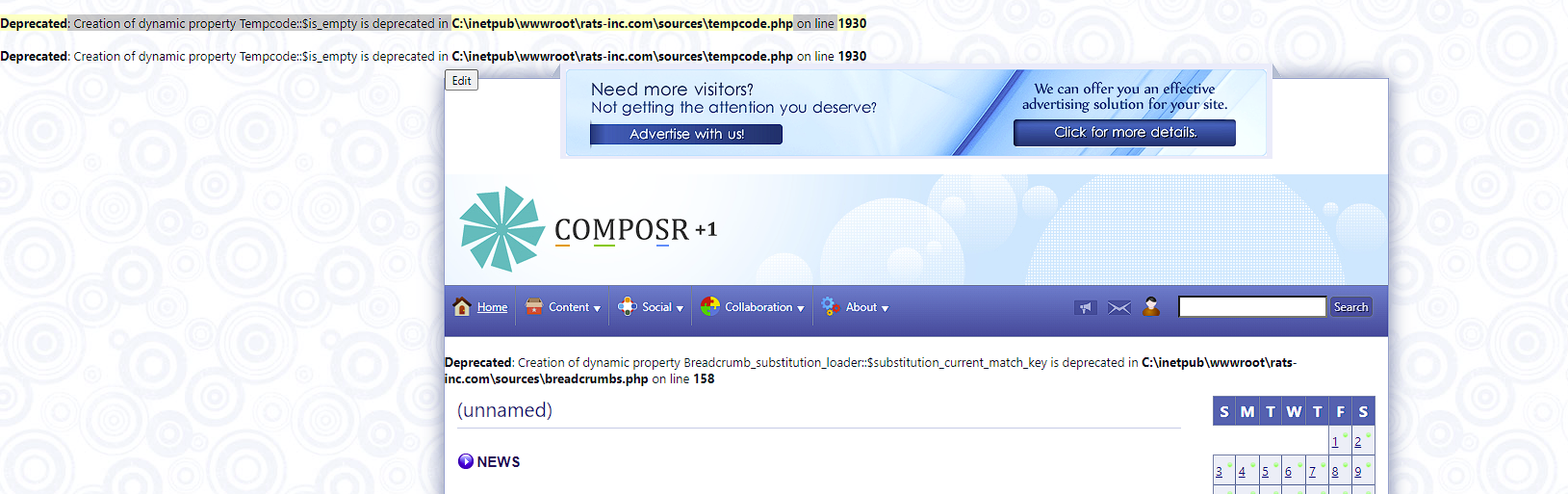 | Steps To Reproduce | After install completed I went to view the site and at the top of the page shows the first line above and under the menu bar the second line above appears. I am using PHP 7.4 on IIS local server. | ||||