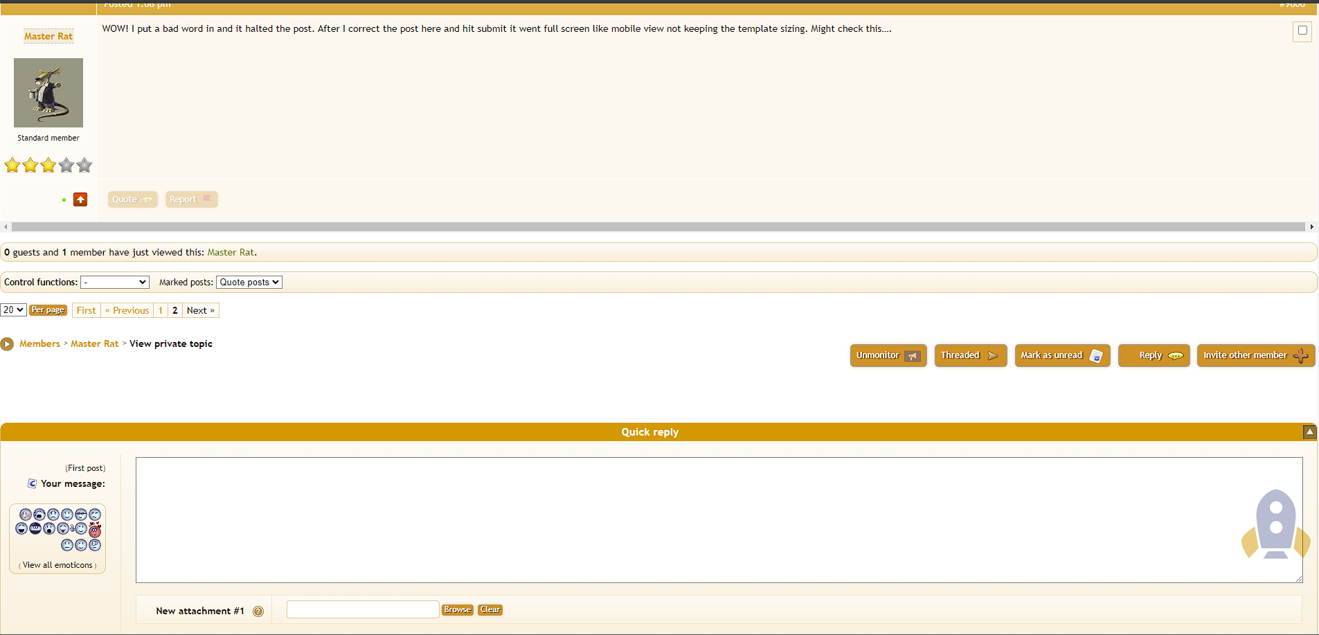 | Description | I wrote a PM to someone. I included a word that is on the bad word list and it caught it, I then deleted the word and hit ok then send after. I sent the PM the screen went into what I would refer to as mobile (Fullscreen) mode and I had to reload from home to get the template back to normal size. | ||||