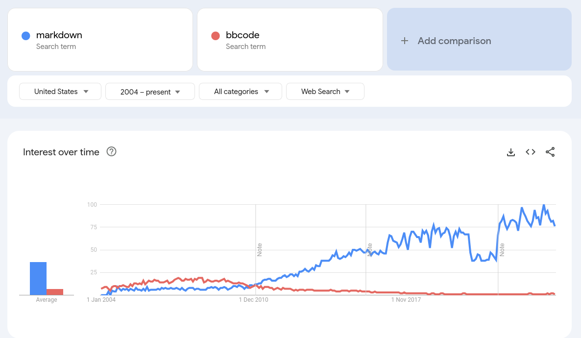 | Description | Markdown has clearly won the war for text-based markup. BBCode-family is of the past. Markdown is supported by Slack, Microsoft Teams, GitHub, GitLab, Discord, Reddit, CKEditor, Wordpress, and Drupal - and anything new is going to be using it. Markdown is going to be far more generatable by LLMs than Comcode, due to large ingestation of source material. We should probably do a hard-shift to Comcode as Markdown-based, with Comcode tags running on top of that. Legacy Comcode would probably best just be updated to the new format via an algorithm. | ||||